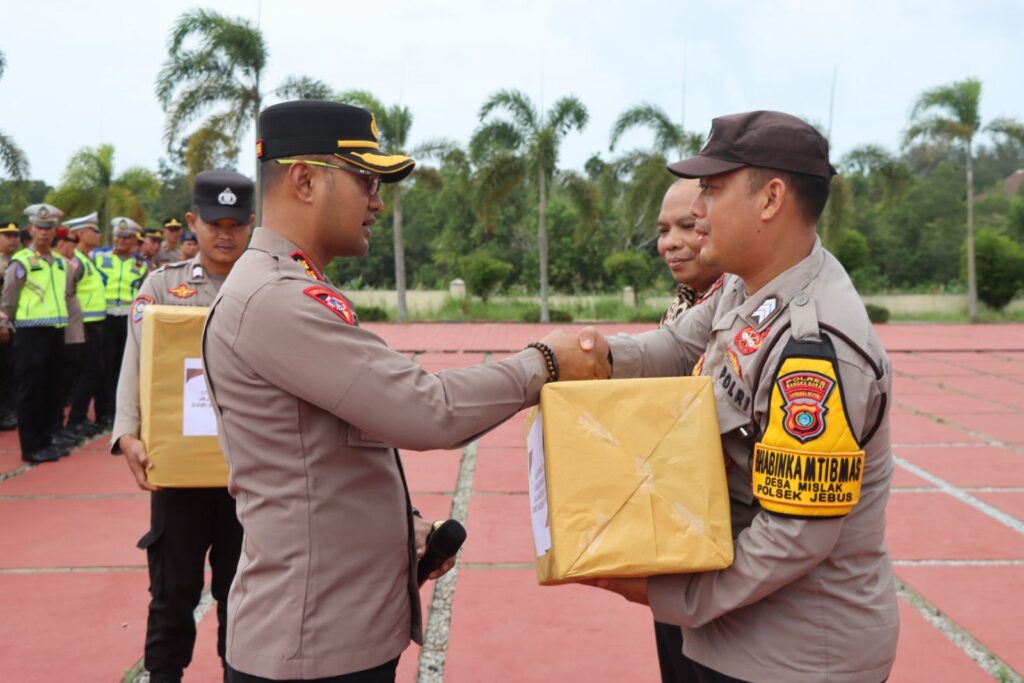 Kapolres Bangka Barat AKBP Pradana Aditya Nugraha, S.H., S.I.K. memberikan penghargaan kepada Bhabinkamtibmas dan Ketua Pos Keamanan Lingkungan (Poskamling) Desa Mislak, Kecamatan Jebus, yang berhasil meraih Juara 3 Lomba Poskamling Tingkat Polda Kepulauan Bangka Belitung.