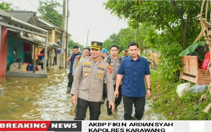 Kapolres Karawang AKBP Fiki N. Ardiansyah turun langsung ke lokasi banjir di Desa Karangligar, Kecamatan Telukjambe Barat, Kabupaten Karawang, guna memastikan kondisi terkini pasca jebolnya tanggul Sungai Citarum yang mengakibatkan sejumlah wilayah permukiman warga terendam banjir (. 20/1/2026 )