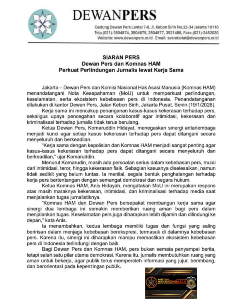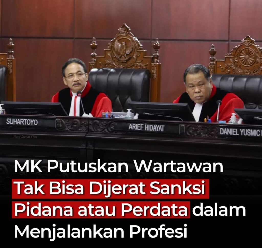 JAKARTA, MPIDTV.COM – Mahkamah Konstitusi (MK) mengabulkan sebagian uji materiil terhadap Pasal 8 Undang Undang-Undang Nomor 40 Tahun 1999 tentang Pers (UU Pers) yang diajukan oleh Ikatan Wartawan Hukum (IWAKUM). Putusan Nomor 145/PUU-XXIII/2025 dibacakan Ketua MK Suhartoyo dalam sidang pengucapan putusan/ketetapan di Gedung MK, Jakarta, Senin (19/1/2026). “Mengabulkan permohonan Pemohon untuk sebagian,” ujar Suhartoyo membacakan putusan Nomor 145/PUU-XXIII/2025, Senin. MK juga menyatakan frasa “perlindungan hukum” dalam norma Pasal 8 UU Pers bertentangan dengan Undang-Undang Dasar (UUD) 1945 dan tidak mempunyai kekuatan hukum mengikat secara bersyarat sepanjang tidak dimaknai “termasuk penerapan sanksi pidana dan/atau perdata terhadap wartawan dalam menjalankan profesinya secara sah hanya dapat digunakan setelah mekanisme hak jawab, hak koreksi, dan dugaan pelanggaran terhadap kode etik jurnalistik berdasarkan pertimbangan dan upaya penyelesaian oleh Dewan Pers tidak mencapai kesepakatan sebagai bagian dari penerapan restorative justice.”
